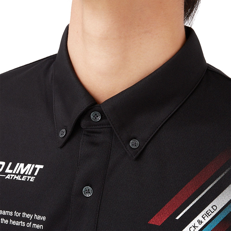 速乾性に優れたポリエステル素材を採用。陸上競技場のレーンをモチーフにした、左胸のグラフィックデザインが特徴的。練習や移動などさまざまなシーンで活躍する、ベーシックなボタンダウンポロシャツ。