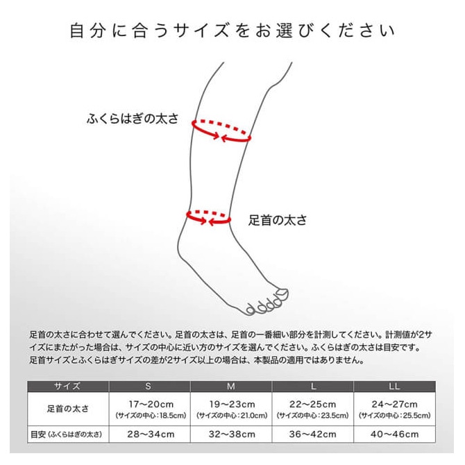 ※カーフスリーブ ふくらはぎ用スリーブ サイズの選び方:足首の一番細い部分の大きさに合わせて(計測値が2サイズをまたがった場合はサイズの中心に近い方を)お選びください。 ふくらはぎの太さは目安です。足首サイズとふくらはぎサイズの差が2サイズ以上の場合は、本製品の適用ではありません。