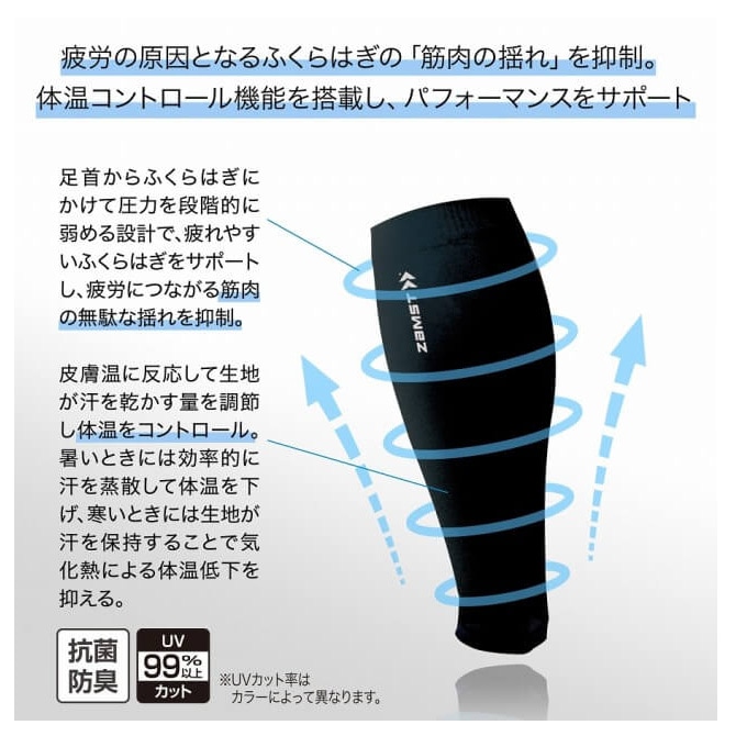 段階着圧設計と筋振動抑制機能:足首からふくらはぎにかけて圧力を段階的に弱める設計で、疲れやすいふくらはぎをサポート。 また、ふくらはぎ全体を圧迫することで、疲労につながる筋肉の無駄な揺れを抑えます。