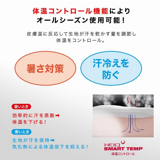 「HeiQ SMART TEMP」による”体温コントロール"機能:皮膚温に反応して生地が汗を乾かす量を調整し体温をコントロール。 暑いときには効率的に汗を蒸散して体温を下げ、寒いときには生地が汗を保持することで気化熱による体温低下を抑えます。