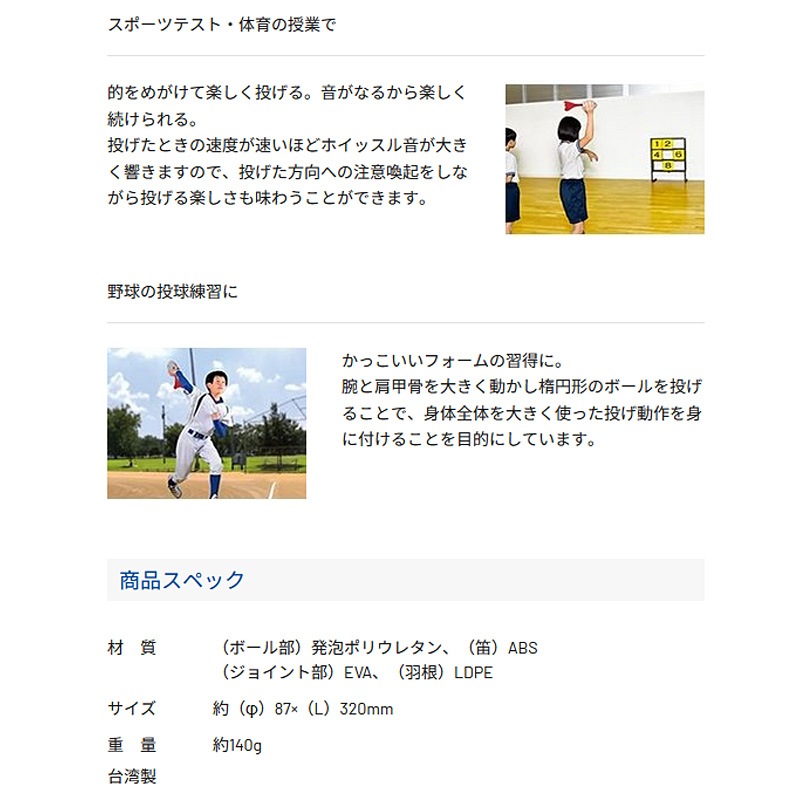 まっすぐ飛ぶと「ヒュー」と笛の音がなります。投げたい方向や角度が合っていないとブレてしまうため、正しい投げ方に対する意識付けがしやすくなります。※「ジャベボール(R)」は株式会社ニシ・スポーツの登録商標です。