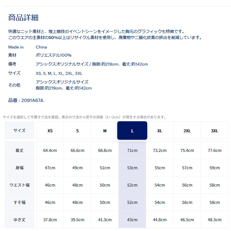 備考:アシックスオリジナルサイズ / 胸囲 約219cm・着丈 約142cm