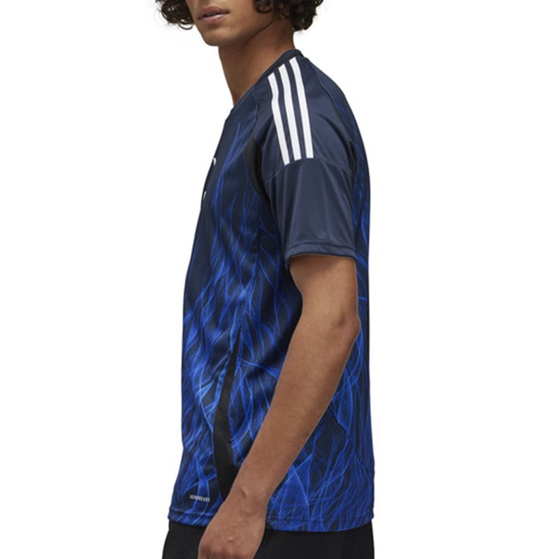 チームのホームカラーのブルーをベースに、日本の力強さを映し出すかのような、うねりを上げて燃えるハンドペイントの青い炎のグラフィックをあしらった、日本代表のレプリカジャージー。