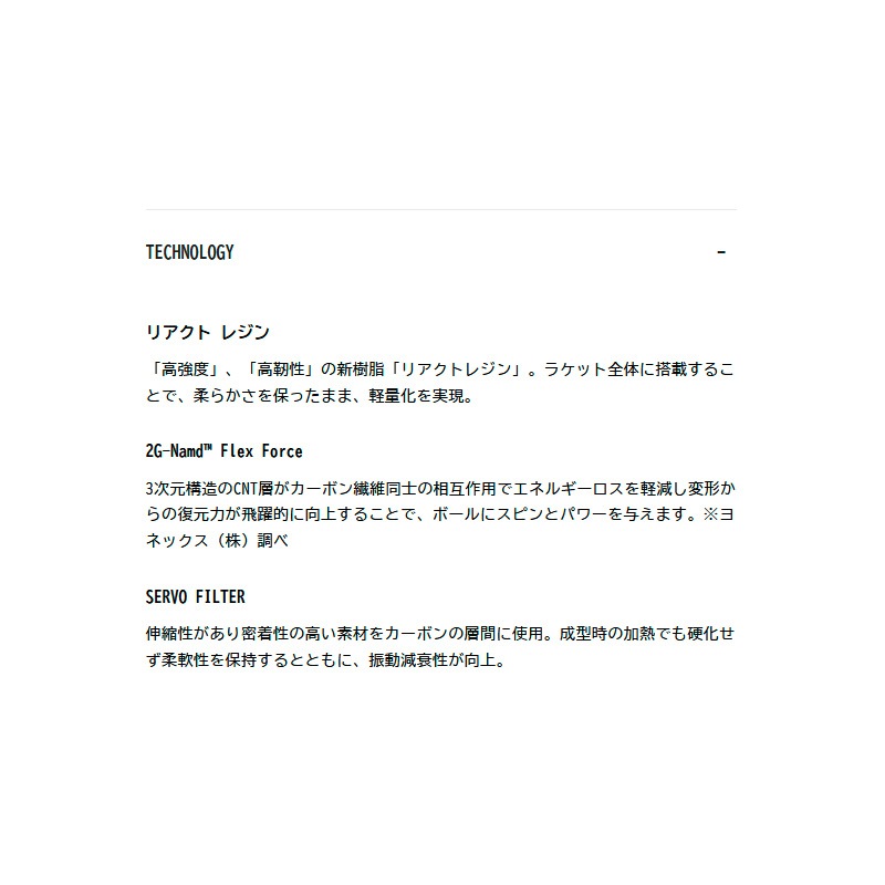 ・リアクト レジン:「高強度」、「高靭性」の新樹脂「リアクトレジン」。ラケット全体に搭載することで、柔らかさを保ったまま、軽量化を実現。