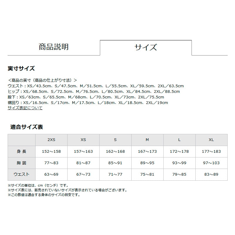 ヒップ:XS/68.5cm、S/72.5cm、M/76.5cm、L/80.5cm、XL/84.5cm、2XL/88.5cm