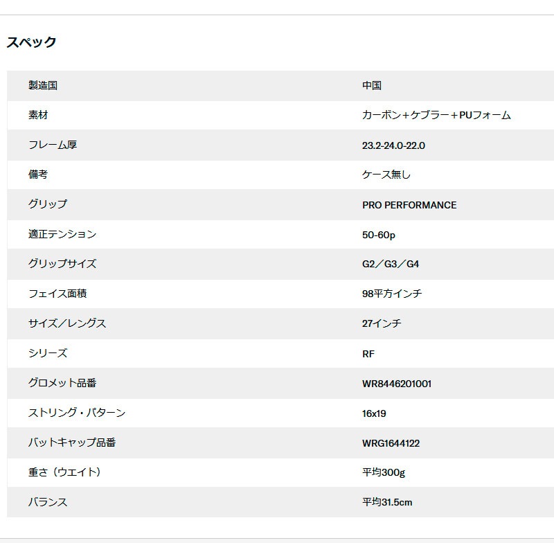 ロジャー・フェデラーが自分自身の為、そして次世代のプレーヤーの為に開発した全く新しいラケット。フェデラーが目指したベースラインに留まらず、前へ攻めるプレースタイルをゴールに開発されたこのラケットは、パワー・コントロール・安定性を兼ね備える。極限まで空気抵抗軽減するために開発された様々な技術は、抜群の振り抜きの良さを実現。