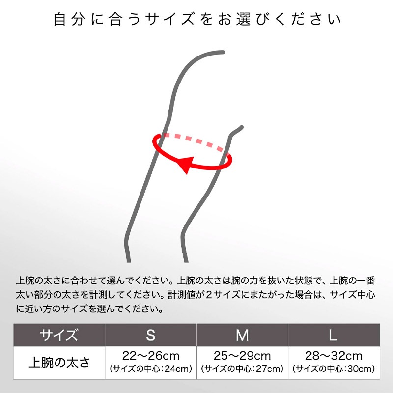 ※アームスリーブ サイズの選び方:腕の力を抜いた状態で、上腕の一番太い部分の太さに合わせて(値が2サイズをまたがった場合はサイズの中心に近い方を)お選びください。