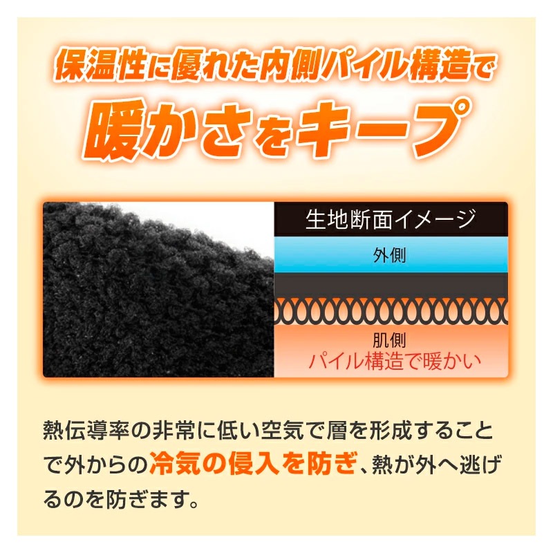 保温性に優れた内側バイル構造で暖かさをキープ。熱伝導率の非常に低い空気で層を形成することで外からの冷気の侵入を防ぎ、熱が逃げるのを防ぎます。