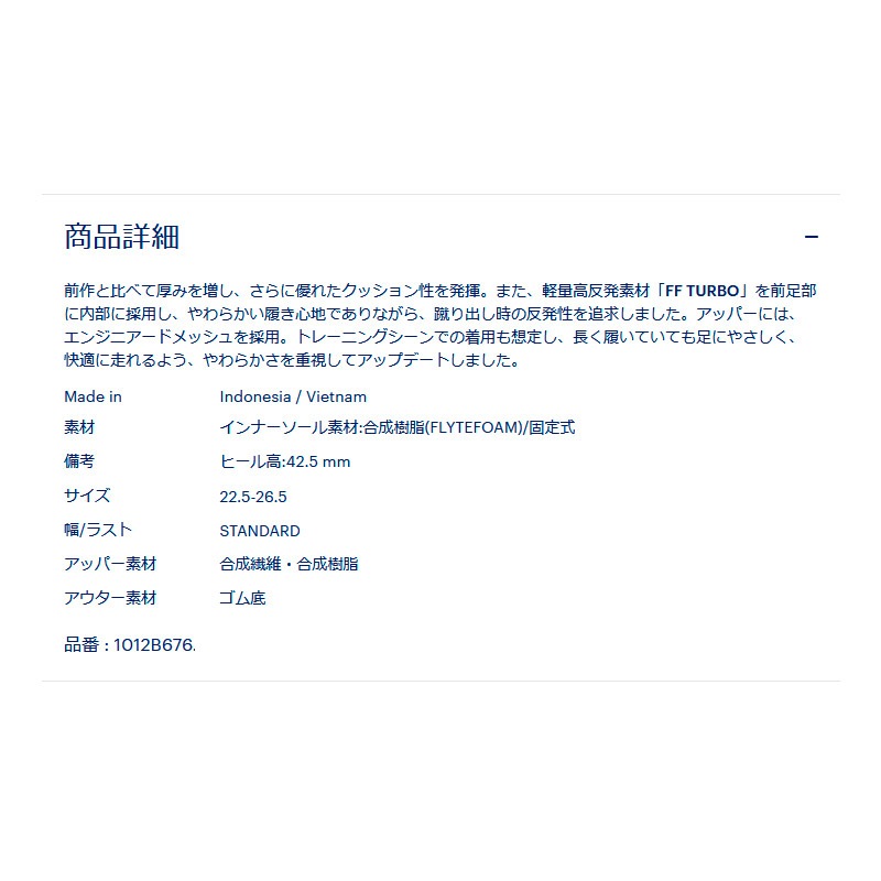 前作と比べて厚みを増し、さらに優れたクッション性を発揮。また、軽量高反発素材「FF TURBO」を前足部に内部に採用し、やわらかい履き心地でありながら、蹴り出し時の反発性を追求しました。アッパーには、エンジニアードメッシュを採用。トレーニングシーンでの着用も想定し、長く履いていても足にやさしく、快適に走れるよう、やわらかさを重視してアップデートしました。