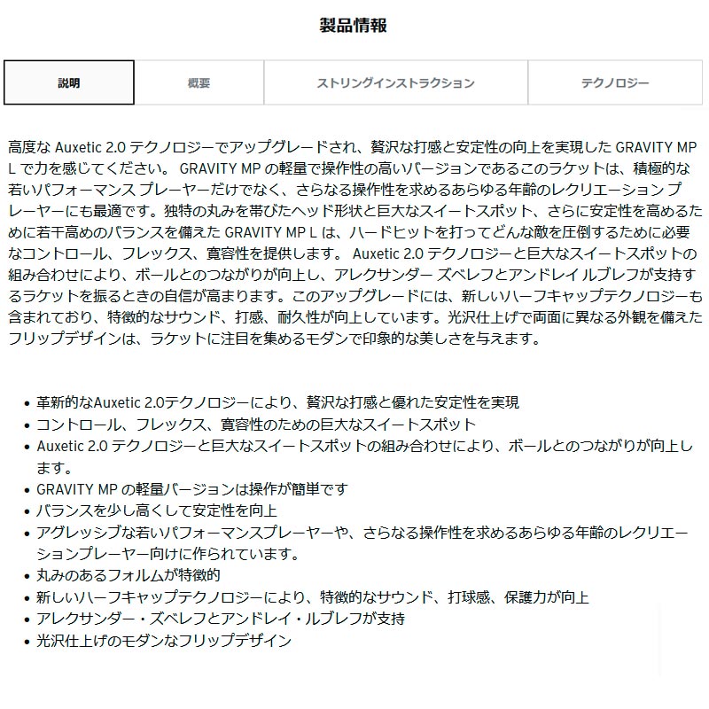 高度な Auxetic 2.0 テクノロジーでアップグレードされ、贅沢な打感と安定性の向上を実現した GRAVITY MP L で力を感じてください。 GRAVITY MP の軽量で操作性の高いバージョンであるこのラケットは、積極的な若いパフォーマンス プレーヤーだけでなく、さらなる操作性を求めるあらゆる年齢のレクリエーション プレーヤーにも最適です。独特の丸みを帯びたヘッド形状と巨大なスイートスポット、さらに安定性を高めるために若干高めのバランスを備えた GRAVITY MP L は、ハードヒットを打ってどんな敵を圧倒するために必要なコントロール、フレックス、寛容性を提供します。 Auxetic 2.0 テクノロジーと巨大なスイートスポットの組み合わせにより、ボールとのつながりが向上し、アレクサンダー ズベレフとアンドレイ ルブレフが支持するラケットを振るときの自信が高まります。このアップグレードには、新しいハーフキャップテクノロジーも含まれており、特徴的なサウンド、打感、耐久性が向上しています。光沢仕上げで両面に異なる外観を備えたフリップデザインは、ラケットに注目を集めるモダンで印象的な美しさを与えます。