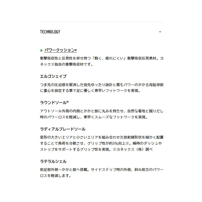 変形の大きいエリアと小さいエリアを組み合わせた放射線形状を細かく配置することで負荷を分散させ、グリップ性が約3%向上(※ヨネックス(株)調べ)。瞬時のダッシュやストップをサポートするグリップ性を実現。