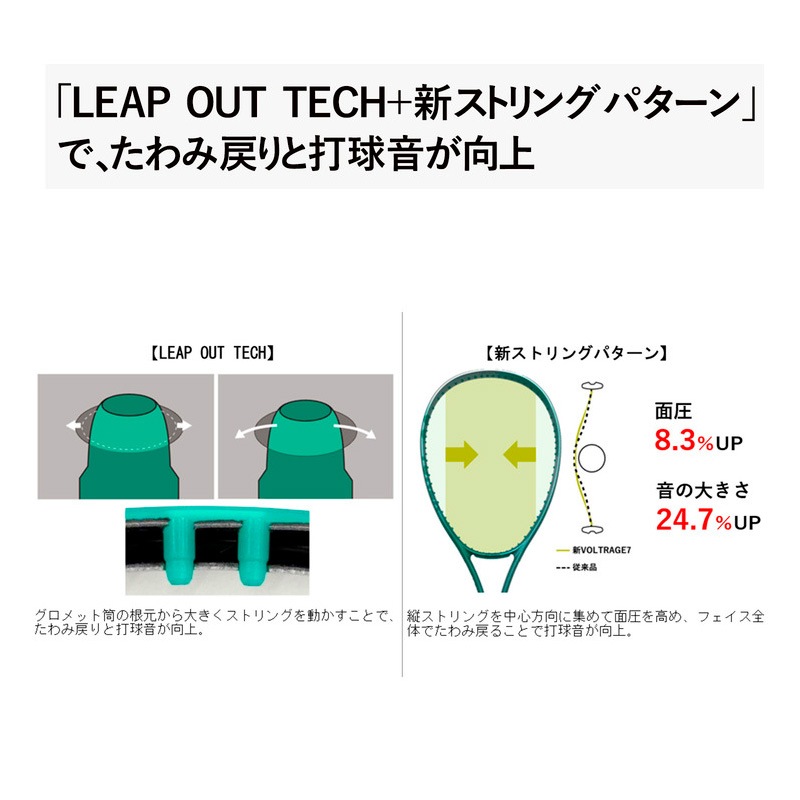 新形状・新素材の採用により、さらなる弾きスピードを実現。フレーム部の正面厚を薄く、シャフト部を厚くした『02VOLTRAGE FRAME』がフェイスのたわみでボールを弾き出し、新素材『MICRO LAMINATECARBON』と『トレカ(R)M46X』が打球感の硬さを抑えつつボールスピードを向上させました。さらに、フレーム内側のグロメット孔を拡大し、強烈なたわみ戻りを起こす『LEAP OUT TECH』と縦ストリングを中心方向に集めた設計により、初代を超えるクリアで高い打球音を実現。圧倒的なボールスピードとプレーヤーの士気を高める打球音を可能とし、従来品にはなかった透明感のあるグリーンのグラデーションデザインを纏い、ボルトレイジシリーズはさらなる進化を遂げました。