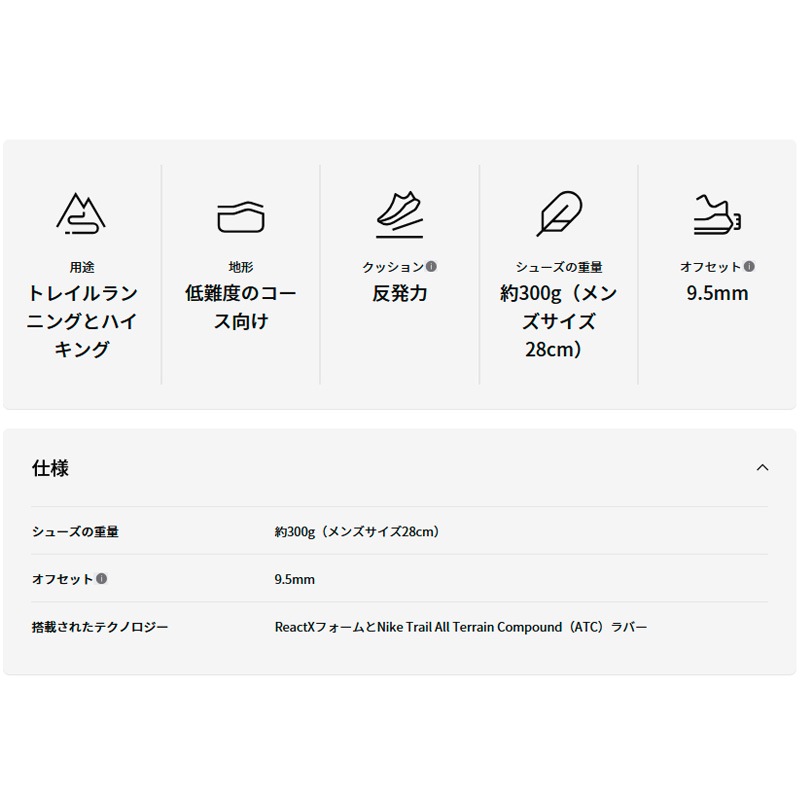 Nike Trail All Terrain Compound(ATC)ラバーアウトソールが、急な坂道や悪天候で優れたグリップを発揮し、路面ではスムーズな足運びを実現。