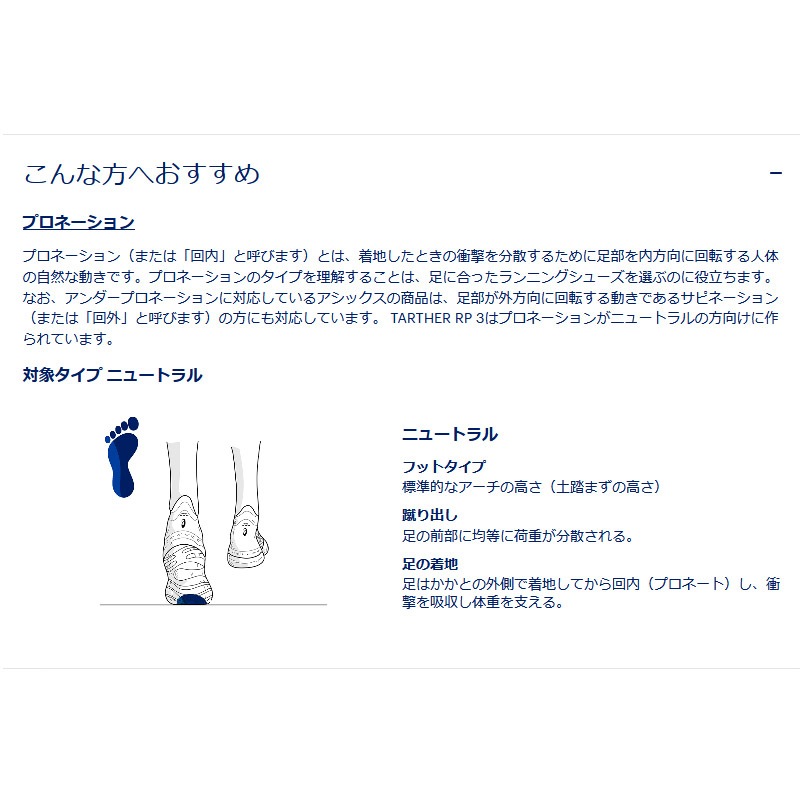 TARTHER RP 3は、自分の足で蹴る感覚を研ぎ澄ませたレーシングシューズです。今までTARTHERのDNAを継承しながら、トレーニングシーンにも適した1足となりました。自己ベスト更新を目指すランナーのレースはもちろん、スピードトレーニングやテンポランにおすすめです。FF BLASTミッドソールが、軽さとエネルギッシュな反発性を生み出します。これに新構造を採用したPROPULSION TRUSSTICを組み合わせることで、自分の足で蹴る感覚とスピード感の両方を高いレベルで両立しています。また、ASICSGRIPアウターソールと3D TETRA SOLEの組み合わせが路面を噛むような優れたグリップ性の発揮に貢献しています。