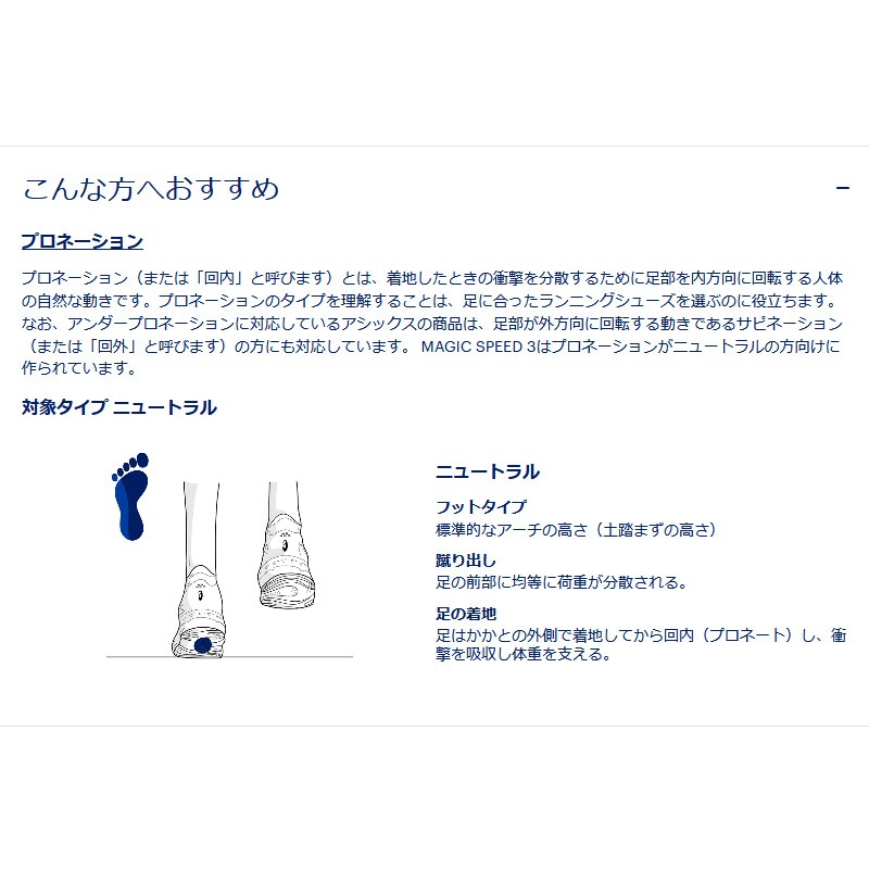 TARTHER RP 3は、自分の足で蹴る感覚を研ぎ澄ませたレーシングシューズです。今までTARTHERのDNAを継承しながら、トレーニングシーンにも適した1足となりました。自己ベスト更新を目指すランナーのレースはもちろん、スピードトレーニングやテンポランにおすすめです。FF BLASTミッドソールが、軽さとエネルギッシュな反発性を生み出します。これに新構造を採用したPROPULSION TRUSSTICを組み合わせることで、自分の足で蹴る感覚とスピード感の両方を高いレベルで両立しています。また、ASICSGRIPアウターソールと3D TETRA SOLEの組み合わせが路面を噛むような優れたグリップ性の発揮に貢献しています。