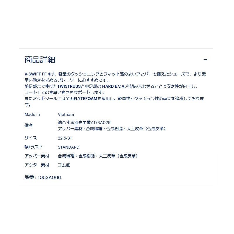 V-SWIFT FF 4は、軽量のクッショニングとフィット感のよいアッパーを備えたシューズで、より素早い動きを求めるプレーヤーにおすすめです。 前足部まで伸びたTWISTRUSSと中足部の HARD E.V.A.を組み合わせることで安定性が向上し、コート上での素早い動きをサポートします。 またミッドソールには全面FLYTEFOAMを採用し、軽量性とクッション性の両立を追求しております。