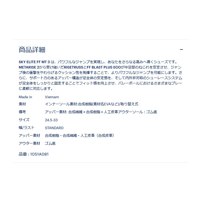 SKY ELITE FF MT 3 は、パワフルなジャンプを実現し、あなたをさらなる高みへ導くシューズです。METARISE 2から受け継いだRISETRUSSとFF BLAST PLUS ECOが中足部のねじれを安定させ、ジャンプ後の衝撃をやわらげるクッション性を発揮することで、よりパワフルなジャンプを可能にします。さらに、サポート力のあるアッパー構造が足全体の安定感を、そして内外非対称のシューレースシステムが足全体をしっかりと固定することでフィット感を向上させ、バレーボールにおけるさまざまなプレーに柔軟に対応します。