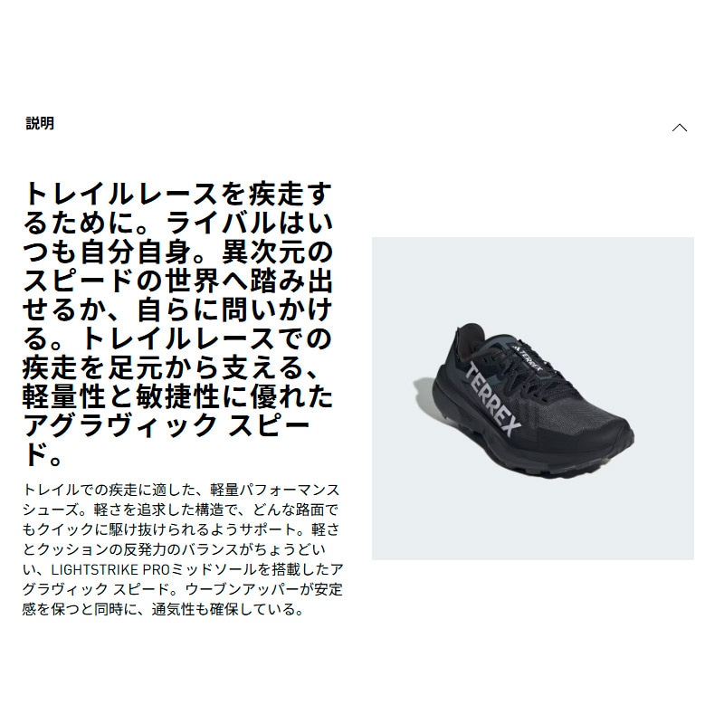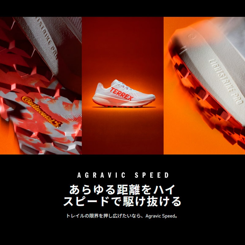 トレイルでの疾走に適した、軽量パフォーマンスシューズ。軽さを追求した構造で、どんな路面でもクイックに駆け抜けられるようサポート。軽さとクッションの反発力のバランスがちょうどいい、LIGHTSTRIKE PROミッドソールを搭載したアグラヴィック スピード。ウーブンアッパーが安定感を保つと同時に、通気性も確保している。