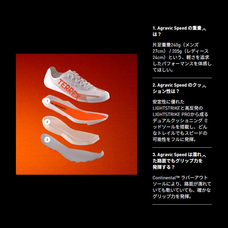 トレイルレースを疾走するために。ライバルはいつも自分自身。異次元のスピードの世界へ踏み出せるか、自らに問いかける。トレイルレースでの疾走を足元から支える、軽量性と敏捷性に優れたアグラヴィックスピード。