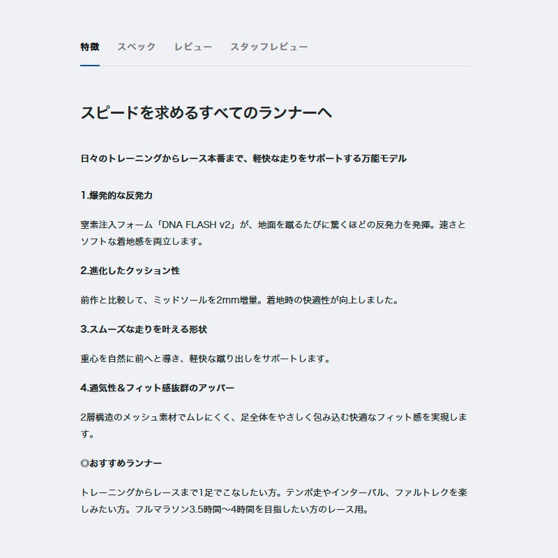 トレーニングからレースまで1足でこなしたい方。テンポ走やインターバル、ファルトレクを楽しみたい方。フルマラソン3.5時間~4時間を目指したい方のレース用。