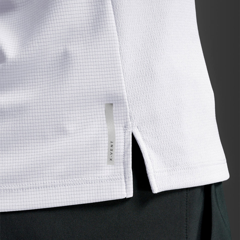 ダブルニット構造のメインパネルは、内側の層で汗を肌から逃がし、外側の層で表面の湿気を分散させることで、素早い湿気管理と 50+ UPF 保護を実現します。