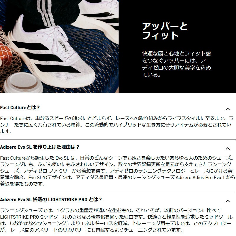 adizero Evo SLで、スピードの感覚を体験しよう。記録を塗り替えてきたadizeroランニングシリーズの革新にインスピレーションを得て、Pro Evo 1の系譜に連なるEvo SLが誕生。走りでも、走り以外でも、軽やかに足元を支える。adizeroテクノロジーに、ランニングレースの世界からインスピレーションを得た大胆でユニークなフォルムを融合。あらゆる場面で、さらなるスピードへ導く。ミッドソールに搭載したLIGHTSTRIKE PROフォームが、優れた反発性と快適なクッション性を提供。