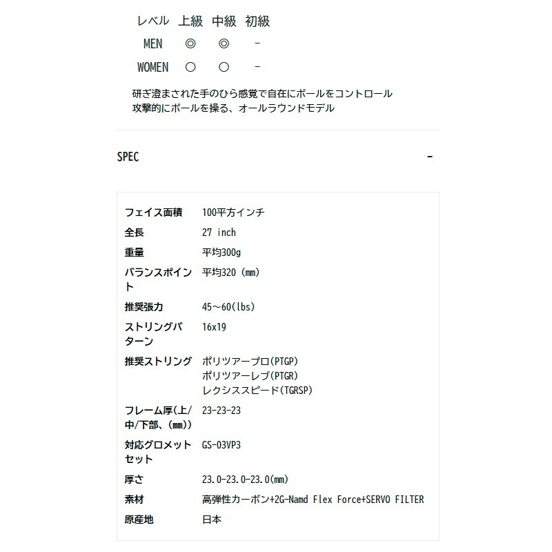 ●推奨ストリング:ポリツアープロ(PTGP)、ポリツアーレブ(PTGR)、レクシススピード(TGRSP)