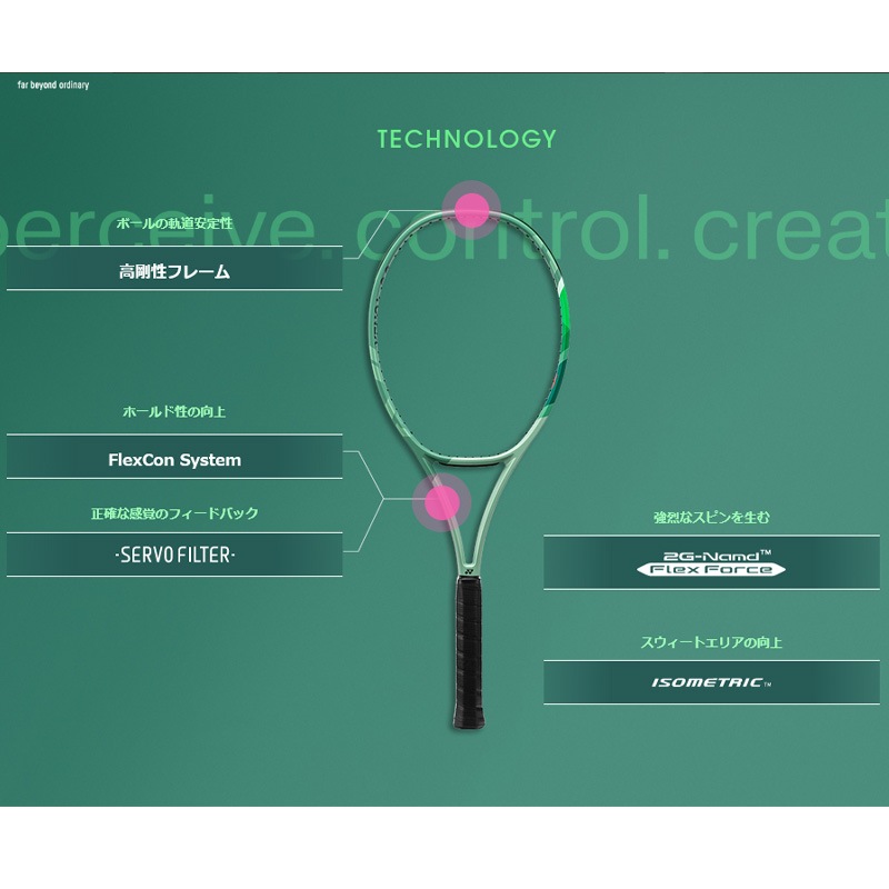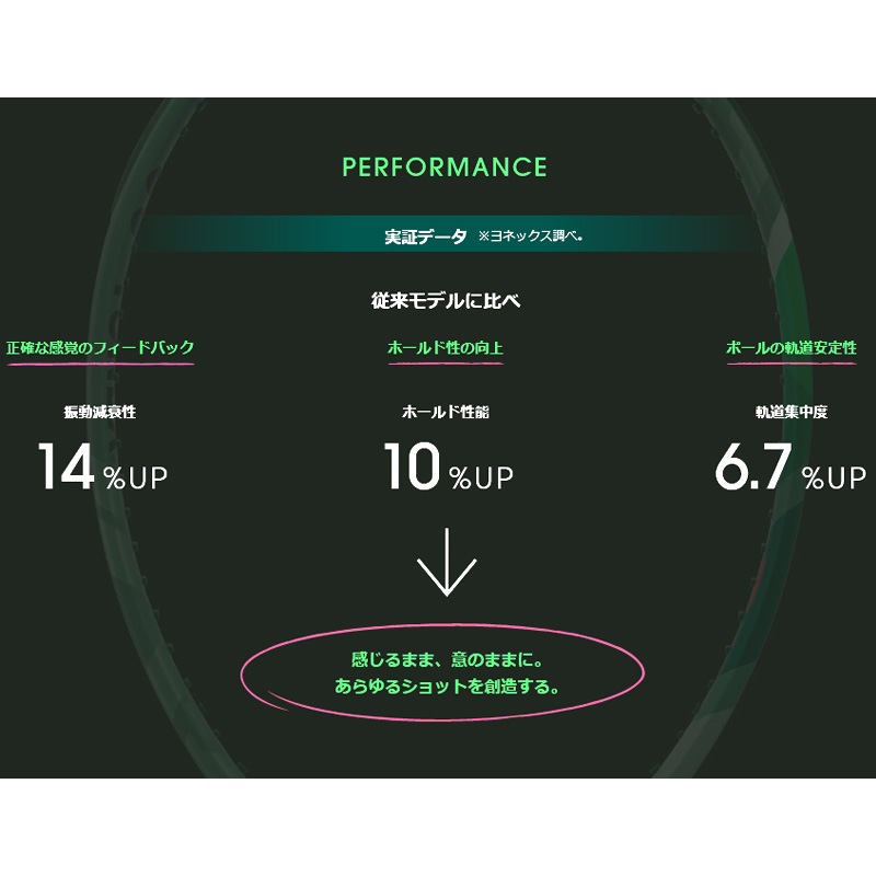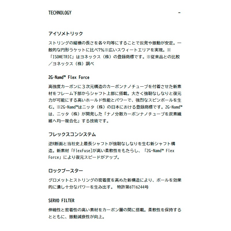高強度カーボンに3次元構造のカーボンナノチューブを付着させた新素材をフレーム下部からシャフト上部に搭載。大きく強靭なしなりと復元力が可能にする高いホールド性能とパワーで、強烈なスピンボールを生む。※2G-Namd(TM)はニッタ(株)の日本における登録商標です。2G-Namd(TM)は、ニッタ(株)が開発した「ナノ分散カーボンナノチューブを炭素繊維へ均一複合化」する技術です。