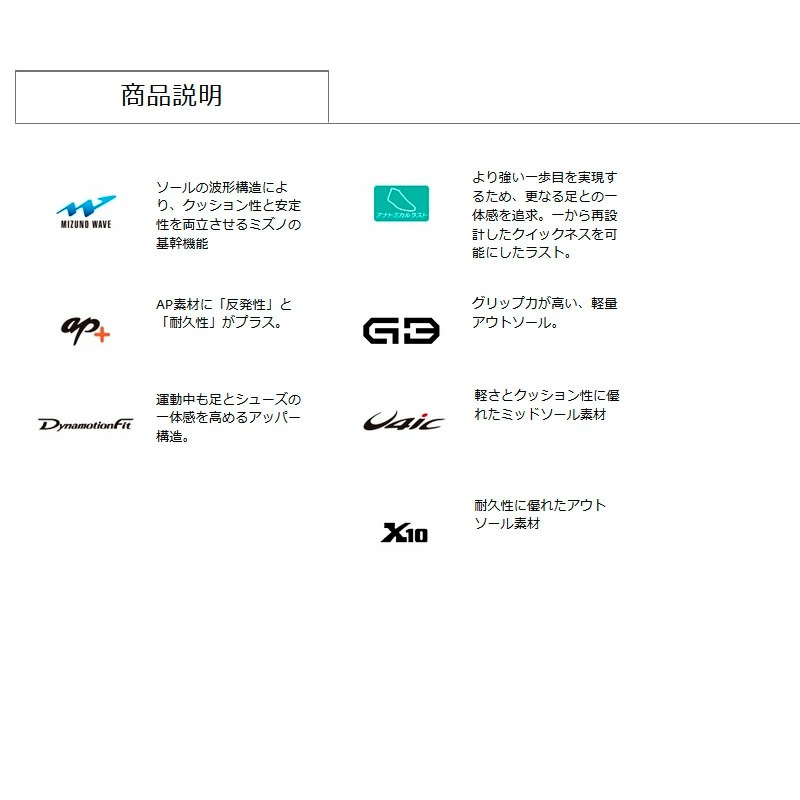 ・MIZUNO WAVE:ソールの波形構造により、クッション性と安定性を両立させるミズノの基幹機能