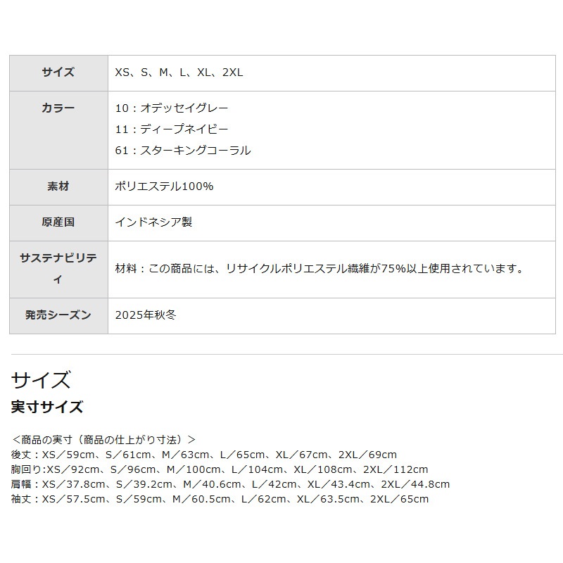 袖丈:XS/57.5cm、S/59cm、M/60.5cm、L/62cm、XL/63.5cm、2XL/65cm