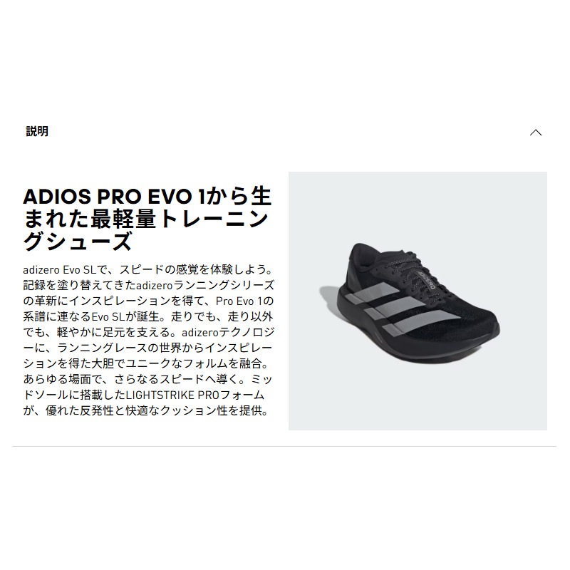 adizero Evo SLで、スピードの感覚を体験しよう。記録を塗り替えてきたadizeroランニングシリーズの革新にインスピレーションを得て、Pro Evo 1の系譜に連なるEvo SLが誕生。走りでも、走り以外でも、軽やかに足元を支える。adizeroテクノロジーに、ランニングレースの世界からインスピレーションを得た大胆でユニークなフォルムを融合。あらゆる場面で、さらなるスピードへ導く。ミッドソールに搭載したLIGHTSTRIKE PROフォームが、優れた反発性と快適なクッション性を提供。