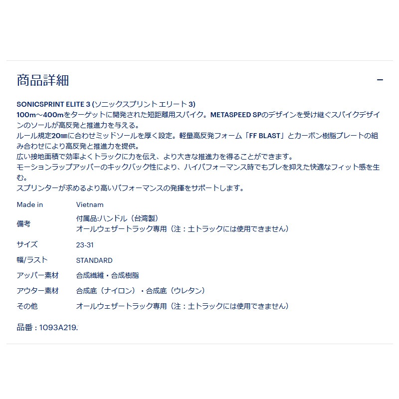 SONICSPRINT ELITE 3 (ソニックスプリント エリート 3)100m~400mをターゲットに開発された短距離用スパイク。METASPEED SPのデザインを受け継ぐスパイクデザインのソールが高反発と推進力を与える。