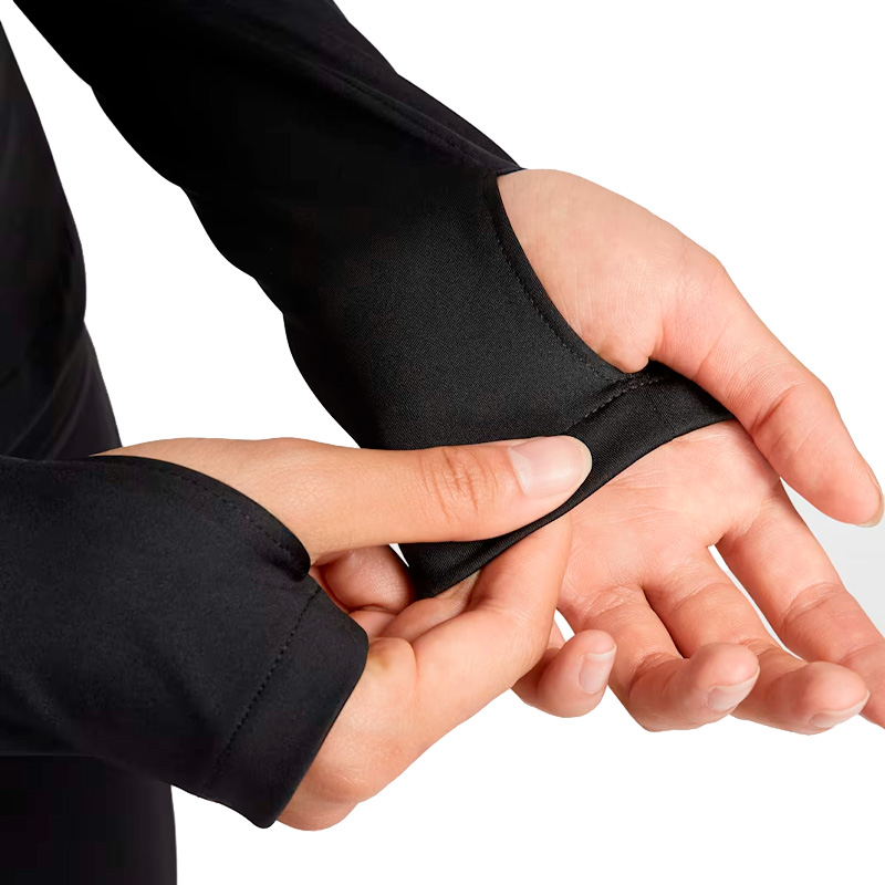 ・ウエスト周りを絞ったスリムフィットのデザインで、他のウェアとの重ね着が簡単。サムホール付きでしっかりカバーでき、袖のずれも防止。イヤホン、鍵、カードなどのアイテムをしまえる、左袖サイドシームのジッパー付きポケット。
