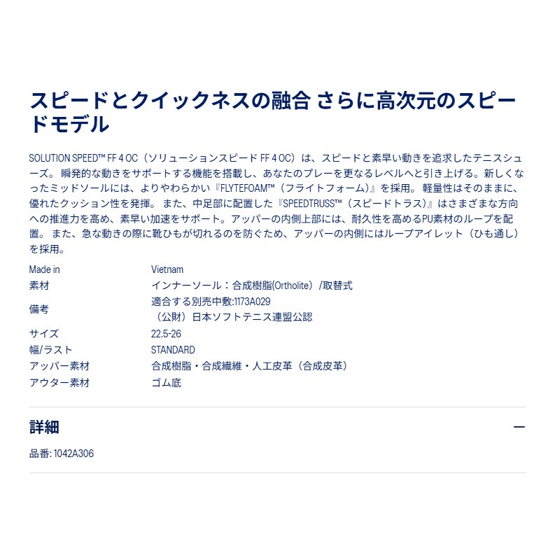 SOLUTION SPEED(TM)FF 4 OC(ソリューションスピード FF 4 OC)は、スピードと素早い動きを追求したテニスシューズ。 瞬発的な動きをサポートする機能を搭載し、あなたのプレーを更なるレベルへと引き上げる。