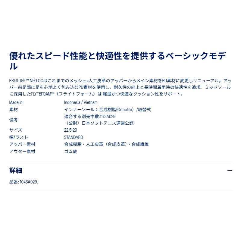 PRESTIGE(TM) NEO OCはこれまでのメッシュ×人工皮革のアッパーからメイン素材をPU素材に変更しリニューアル。アッパー前足部に足を心地よく包み込むPU素材を使用し、耐久性の向上と長時間着用時の快適性を追求。ミッドソールに採用したFLYTEFOAM(TM)(フライトフォーム)は 軽量かつ快適なクッション性をサポート。