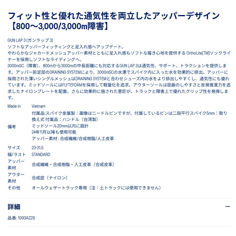 3000mSC(障害)、800mから3000mの中長距離にも対応するGUN LAP 3は通気性、サポート、トラクションを提供します。アッパー前足部のDRAINING SYSTEMにより、3000mSCの水濠でスパイク内に入った水を効果的に排出。アッパーに採用された薄いシングルメッシュはDRAINING SYSTEMと合わせシューズ内の水をより排出しやすくし、通気性にも優れています。ミッドソールにはFLYTEFOAMを採用して軽量化を追求。アウターソールは屈曲のしやすさと反発推進力を追求したナイロンプレートを配置。さらに効果的に施された意匠が、トラックと障害上で優れたグリップ性を発揮します。