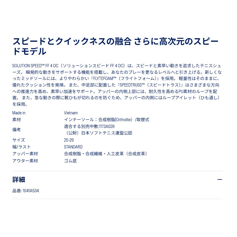 SOLUTION SPEED(TM)FF 4 OC(ソリューションスピード FF 4 OC)は、スピードと素早い動きを追求したテニスシューズ。 瞬発的な動きをサポートする機能を搭載し、あなたのプレーを更なるレベルへと引き上げる。